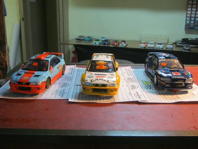 Mientras, en el parque cerrado, esperaban tres versiones distintas de recorte del tan traido y discutido morro del subaru con la reglamentación CNR, que preciosos los 3, a ver quien se fijaba en ello..........